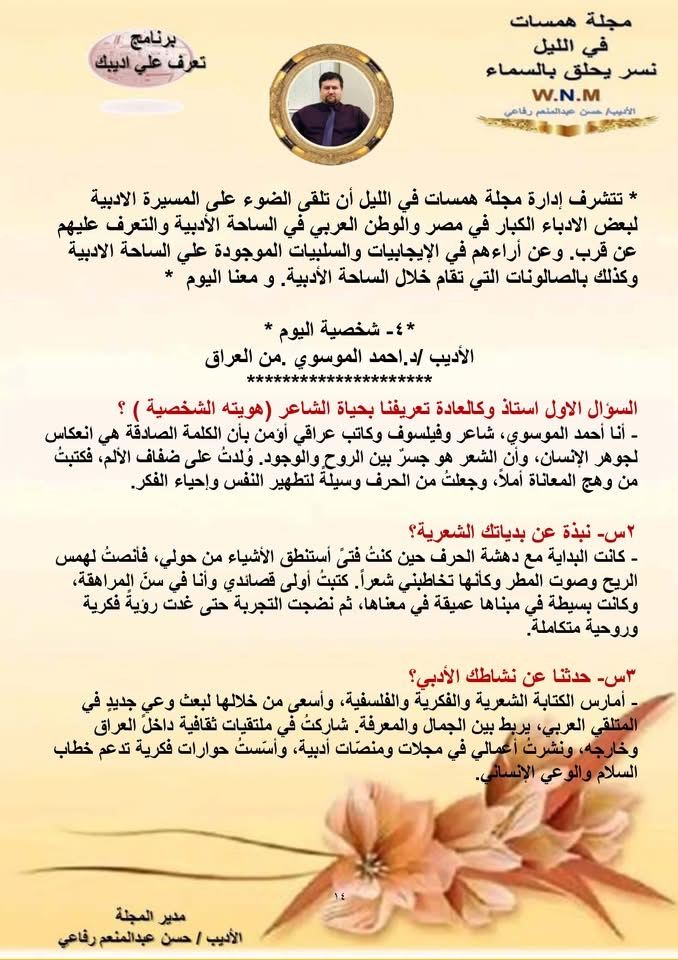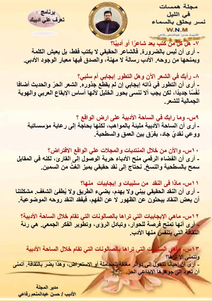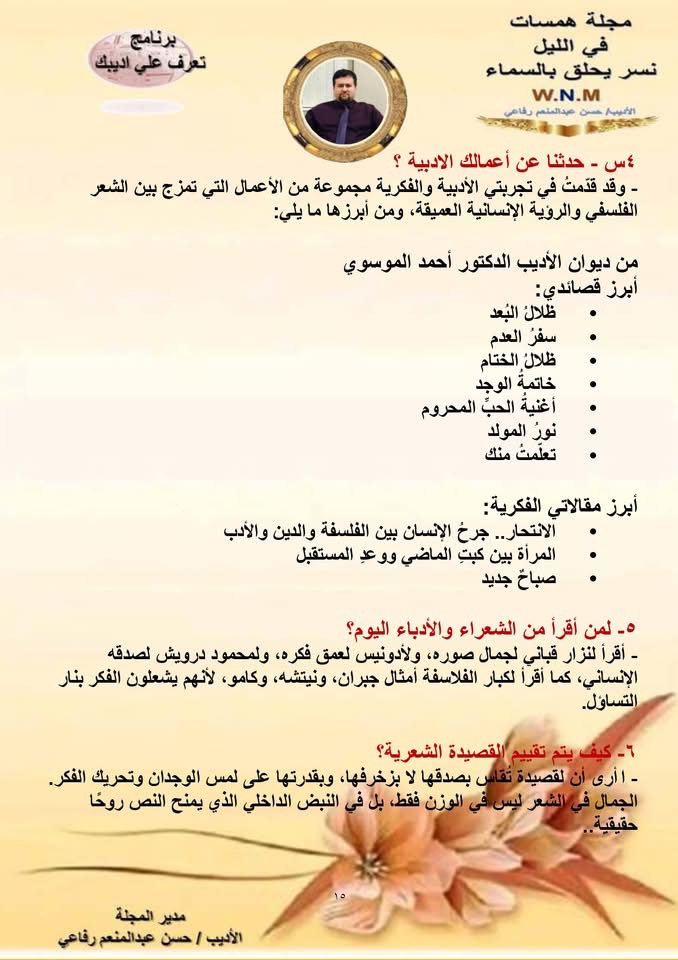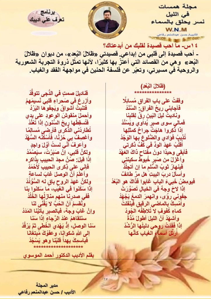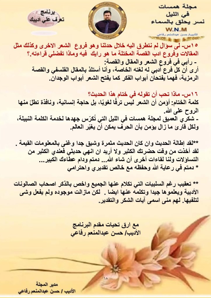 من حواري مع مجلة همسات في الليل، يسرّني أن أضع بين أيديكم هذا اللقاء الذي جاء محمّلًا بعمق الأسئلة ورحابة الفكر. شكري العميق لإدارة المجلة على هذا الاهتمام، وللأديب الأستاذ حسن عبدالمنعم رفاعي على روحه الراقية وإجادته في إدارة الحوار، فقد كان لحضوره أثر جميل أضاء هذا الحديث وأضاف إليه الكثير.